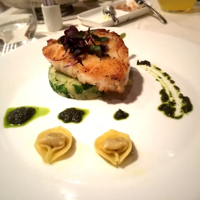 全晚我最喜歡的便是主菜。我喜歡吃魚,所以吃西餐十次有八次都會以魚作主菜。這個智利鱸魚真是這些年來吃過最好吃的。肉身厚、嫩得很、多汁,我還道自己在吃銀鱈魚呢。托底的是西難蘭花嫩薯蓉,味道淡淡的,吃不了很多。伴碟的那兩個小ravioli有點硬身,不吃也可。