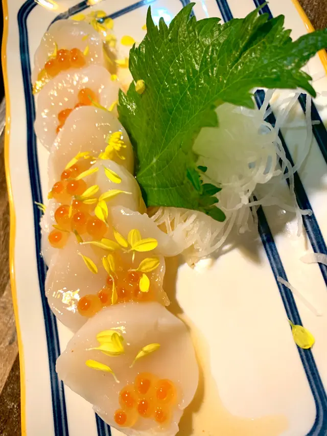 擺盤精美,帆立貝色澤光鮮,肉質爽甜,沾上柚子醋和三文魚籽,鮮味大提升