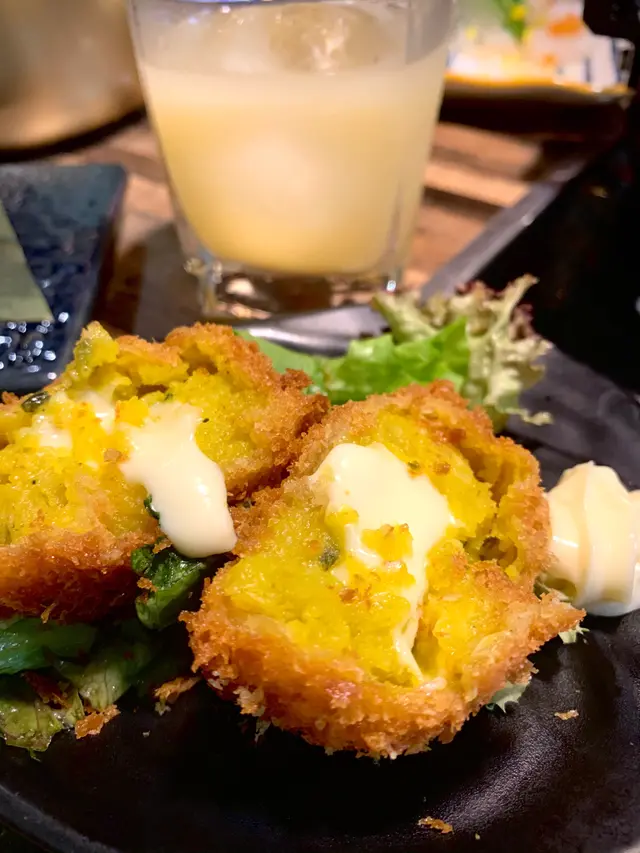 芝士餅有驚喜,外層炸至酥脆,內裡是鮮甜南瓜蓉,中間是澎湃的芝士湧岀,好吃