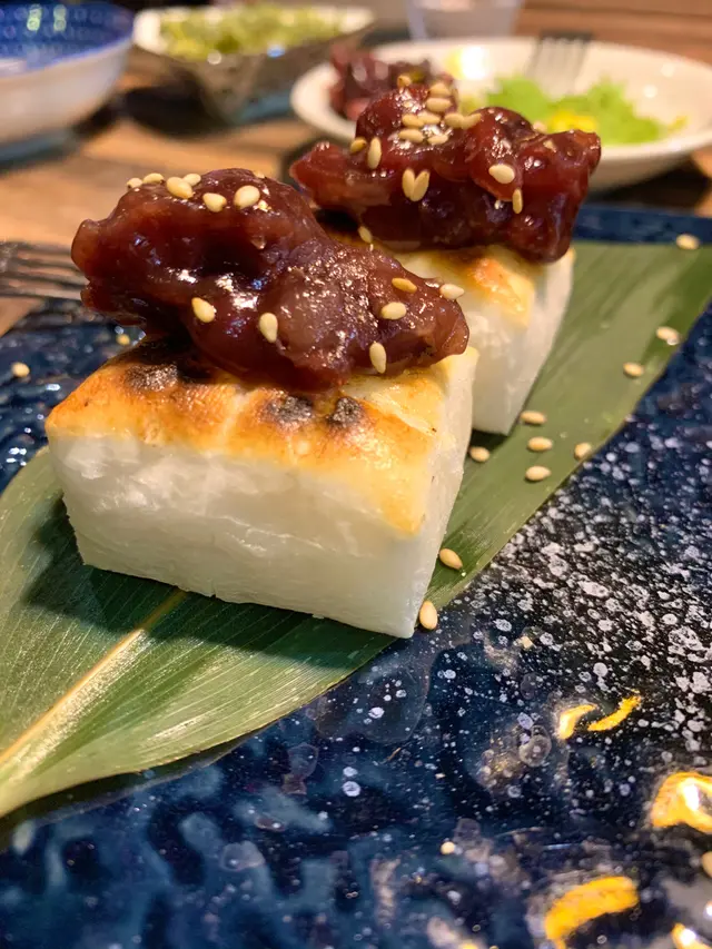 年糕即叫即燒,日本年糕燒至金黃色,外脆內軟,富有嚼勁,以粒粒紅豆和豆蓉點綴,讚!