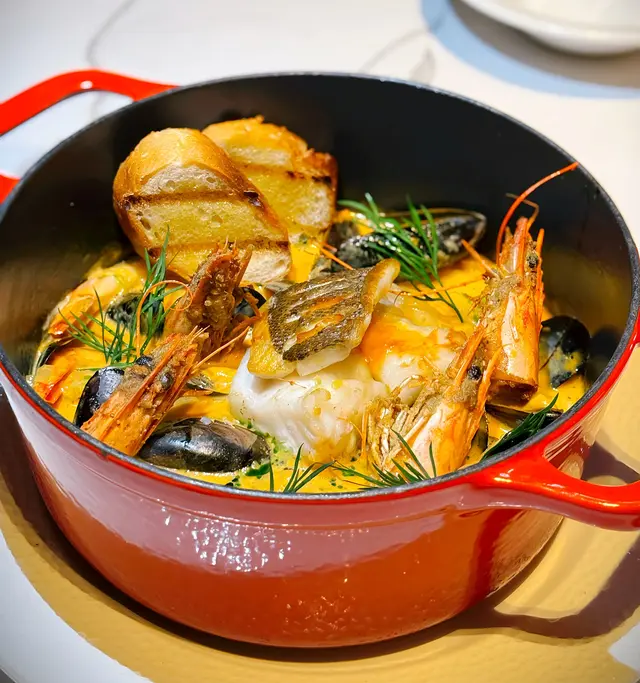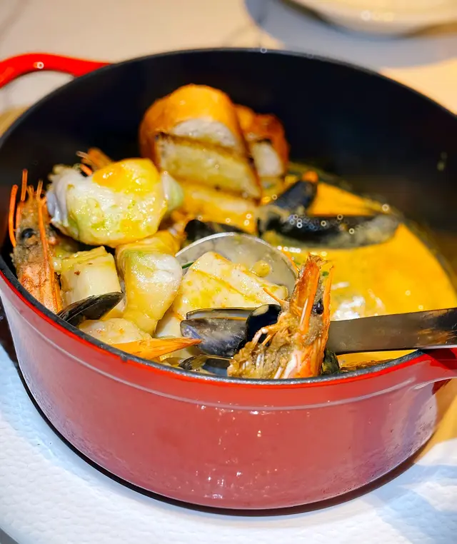 店員一打開蓋子的時候,我們真的嚇了一下,沒想過這海鮮湯的份量驚人,內裏有很多不同的海鮮包括魚、蝦、青口和帶子。除此之外,還有兩片麵包可供醮上湯頭一起吃。