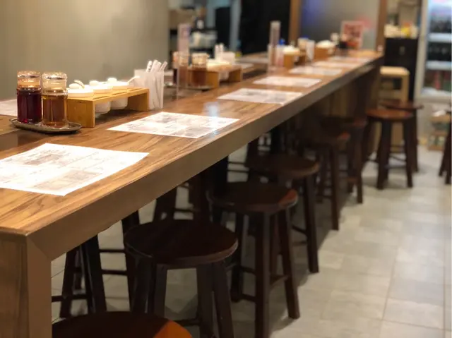 木製桌椅,很簡樸明亮,給人很舒適的感覺,整齊的放上各種調味配料。