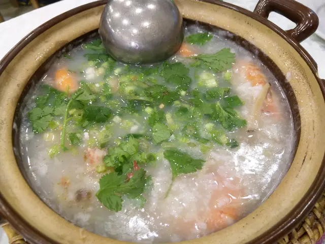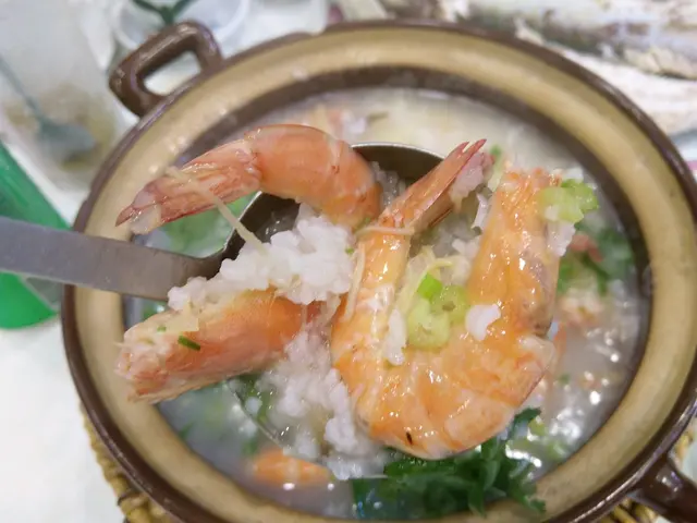 鮮蝦砂鍋粥$128,最後來個潮州砂鍋粥清一清喉嚨,以蝦就主食,將蝦的甜滲入粥水,除了蝦還有乾瑤柱,有這兩樣做粥的底料,加上砂鍋均勻將熱力散佈,煮出來的粥又怎會不好食?