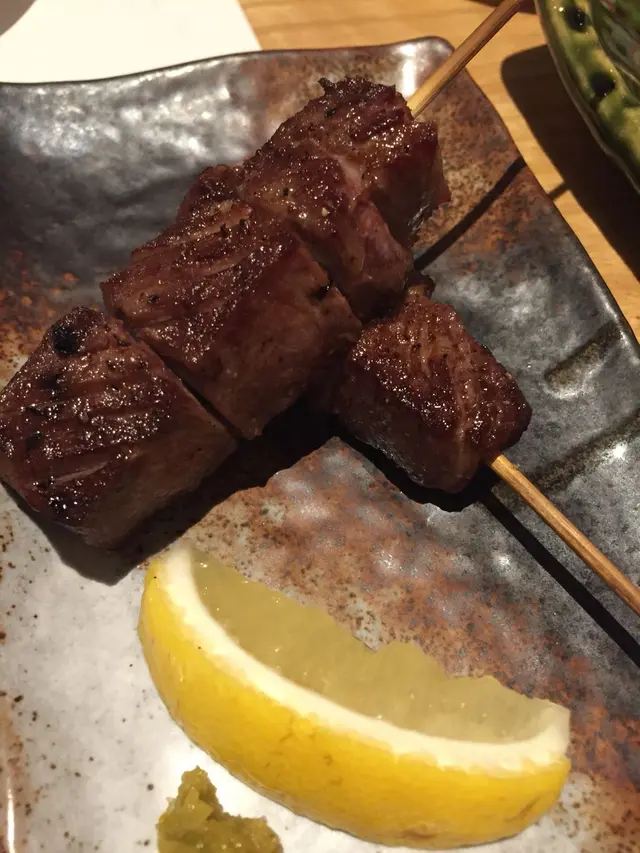 然後叫了免治雞肉串燒,沾上温泉蛋,口感特別。除了免治雞肉串燒,還點了牛舌串燒,牛舌一點也不會硬,牛舌內裏多汁,燒得剛剛好!