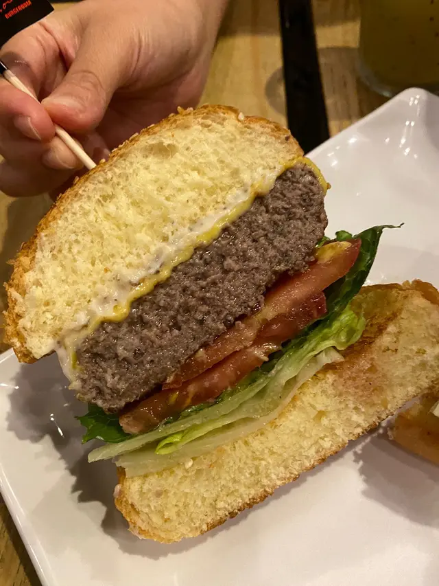 一來見到個手掌咁大嘅漢堡,迎面聞到黑松露醬香氣爆擊,切口一半見到厚實牛肉排鮮嫩多汁,濃郁松露奶香與焦香肉排完美交融,每一口都係奢華享受。配料有生菜和蕃茄片配搭令到口感清脆平衡膩感!