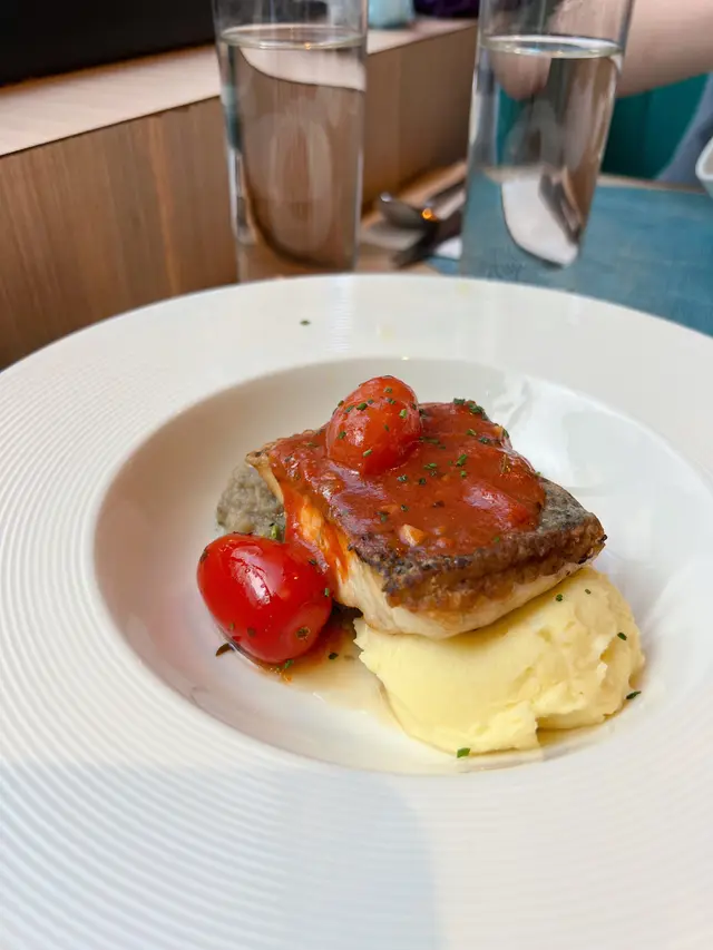 鱸魚層皮煎得好香💁🏼♀️魚肉未到嫩滑但未至於柴😗薯蓉好味,綿滑而且好重牛油味🧈旁邊pat茄子蓉就還好🍆
