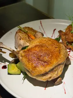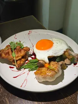 鴨髀上面比一隻大太陽蛋覆蓋住,非常吸引🥰 鴨髀煎到外皮夠脆,鴨肉煮得夠腍,一切就散開🤪 食落鴨肉好嫩,鴨肉汁超級香,充滿成個口腔😮 加埋窩夫同埋蛋黃汁,超級滿足👍🏻