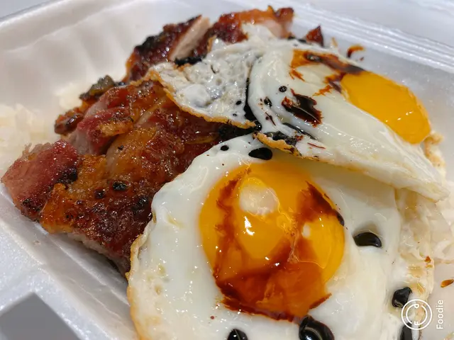 暗然銷魂鴛鴦飯,包括左半肥瘦叉,煎雞扒同埋兩隻煎蛋。呢個係真係好抵呀一個價錢三種享受。