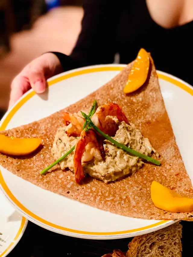 以蕎麥粉做的鹹味可麗餅餅皮稍帶焦香, 麥味突出,邊緣位置略帶酥脆,而沾了醬汁的部位則口感軟糯,吃起來很有質感。配上爽彈海蝦、鹹鮮蟹蓉、清甜芒果及爽脆蘆筍,味道協調之餘,亦頗飽腹。
