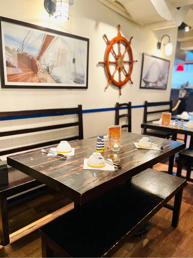 可麗餅原本是天主教聖燭節La Chandeleur 的應節食品,在法國西北部沿海地區的Bretagne (英作Brittany) 非常流行,而且發展出很多不同的配搭,成為一個具代表性的地區美食。店內裝潢呼應Brittany 區的航海主題,到處放置了帆船模型和掛畫,連桌上的調味料瓶也是燈塔造型,加上昏暗的燈光和柔和的音樂,令人有如置身於悠閒寧靜的小鎮。店員主要講英語,熱情親切地向客人介紹菜單。