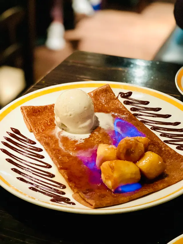 上桌時,侍應會在上面淋上燃燒中的Grand Marnier酒,視覺效果一流。口感煙韌的可麗餅放上雲呢拿雪糕和焦糖化香蕉,味道討好之餘不會過於甜腻,也沒有掩蓋互相的味道。
