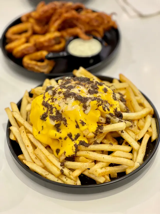 用主菜既碟裝滿熱辣辣薯條😹大癲 (唔好同我講去M記都有🙃) 有滿滿既車打芝士配上黑松露碎🥹都好有誠意啊、好正好慰藉心靈😂