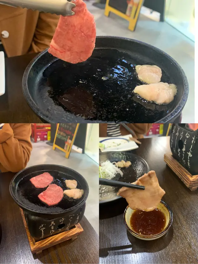 淨係望到過爐已經覺得非常之有誠意,自己去燒特別過癮,首先將啲脂肪燒成油,再將牛舌放上去,望住啲牛舌慢慢燒到變色,微微焦香就可以食啦,其實唔需要落調味料已經好好食,肉質微彈,香味濃郁。