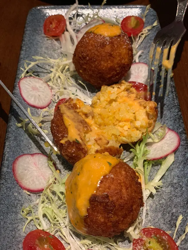 最後推介韓風手工芝士波,雖然英文寫係risotto ball with kimchi sauce,食落我感覺上有蟹肉如薯仔嘅味道,係一個好典型人人都鍾意食嘅小食!