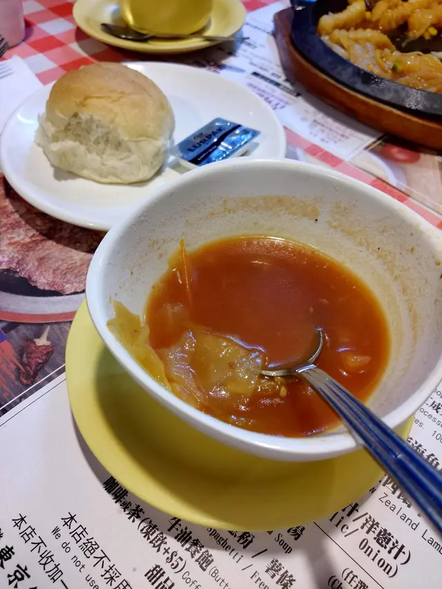 餐牌主要是各或肉類放在鐵板上, 另加$22可配飯/意粉/薯菜, 還有餐湯, 餐包, 飲品和甜品! 也沒什麼原因不花那一點點錢來完整這晚餐吧。餐湯喝到一半才記得拍照, 餐包上枱時微暖, 付上一小塊牛油。餐湯最特出之處是混在湯的一兩粒牛肉碎, 明顯是把餐牌內的下欄碎肉物盡其用, 不過我也毫不