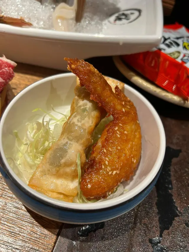套餐仲包前菜沙律、炸餃子同芝麻雞翼,同埋蔬菜拼盤。 最後揀咗南瓜芋頭粥做粥底,吸收晒海鮮嘅精華,好鮮甜!