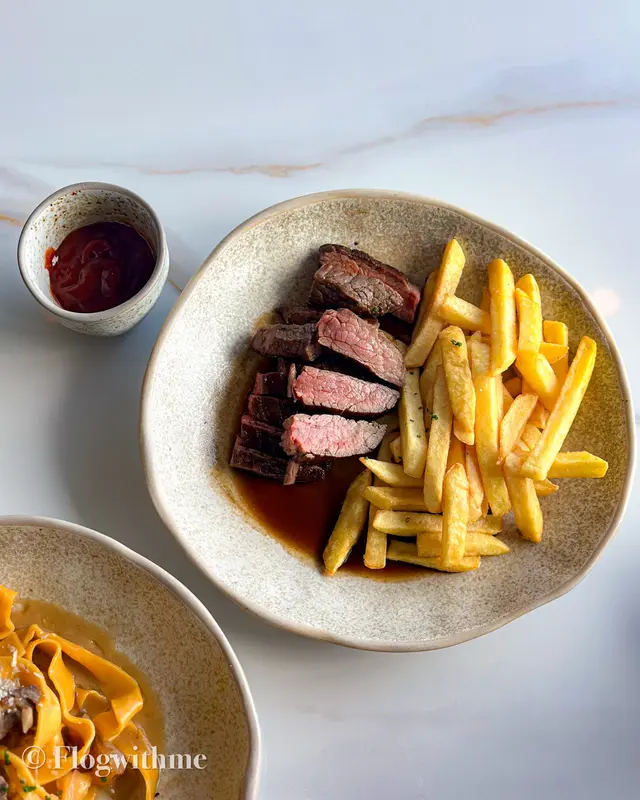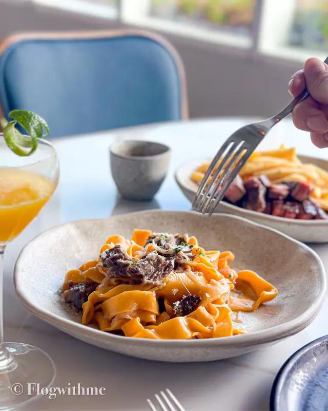 主菜就可以每人一份,自己更鍾意Beef ragu pappardelle,煮麵食落去都幾有咬口,燴牛面頰肉幾入味❤️另一份就要咗Steak and fries (+$130),flank食落去肉味濃,而且薯條炸得幾香口,調味以鹽同胡椒為主🥩搭配cocktail/mocktail係將成件事再昇華咗,今次要嘅The Kiss 同Thyme of life都係行清新路線🌿