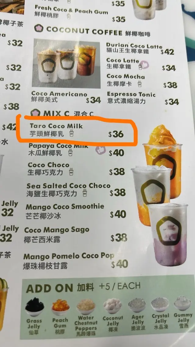 後尾睇收據寫椰香鮮椰奶,唔怪之有芋頭味嘅椰奶,改咗名但個餐牌又唔改,真係有期望落差⋯⋯