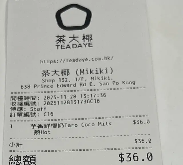 今日將我嘅quota俾咗茶大椰,但係失望⋯⋯餐單寫芋頭鮮椰乳,叫咗一杯熱嘅,點知冇芋頭粒⋯⋯其他手搖飲品店$36呢個價位都會有啲粒粒芋頭,所以冇我覺得驚訝