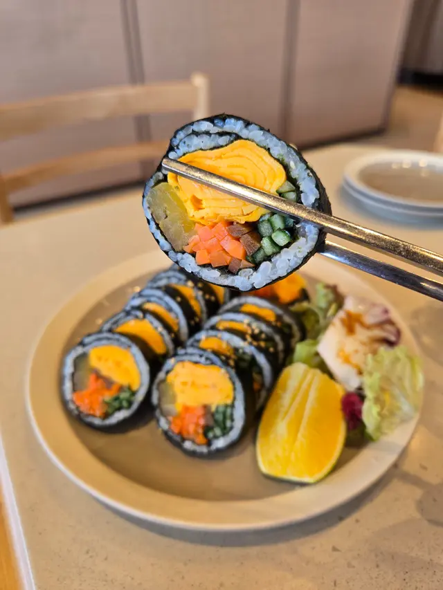 左飯卷的一半,加上青瓜,紅,黃蘿蔔等配件和飽滿的飯粒,食落就係傳統的好味道。