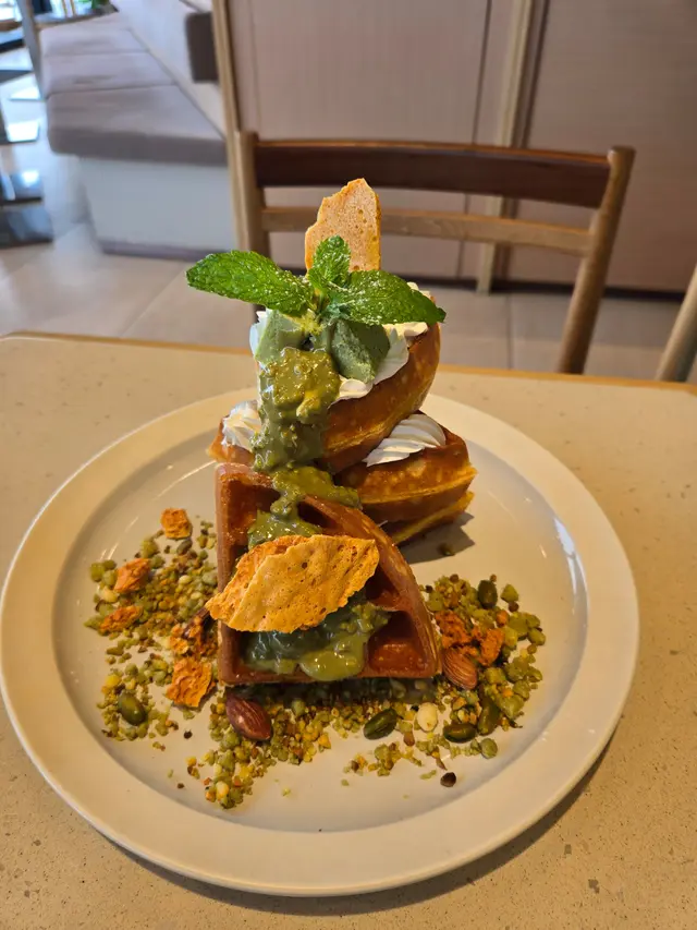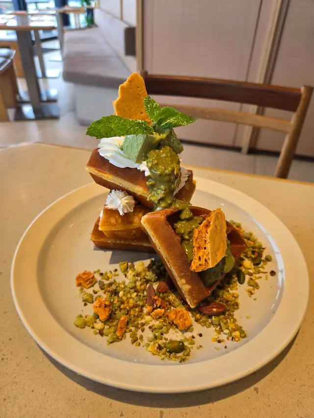 開心果蜜糖窩夫,賣相滿分。窩夫外脆內軟,