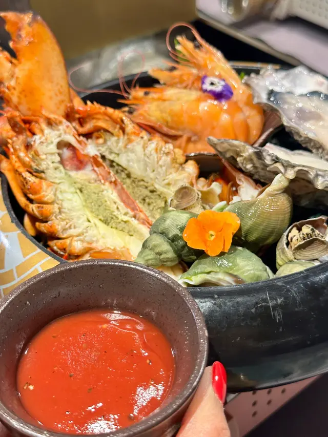 好多款海鮮,新鮮甜美,超大隻龍蝦,勁多蝦膏,啖啖肉,鮮甜生蠔,仲有新鮮螺同海蝦,配黑椒蕃茄醬更惹味