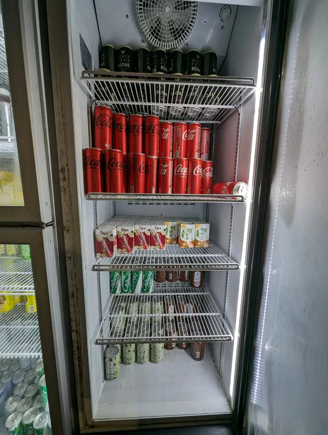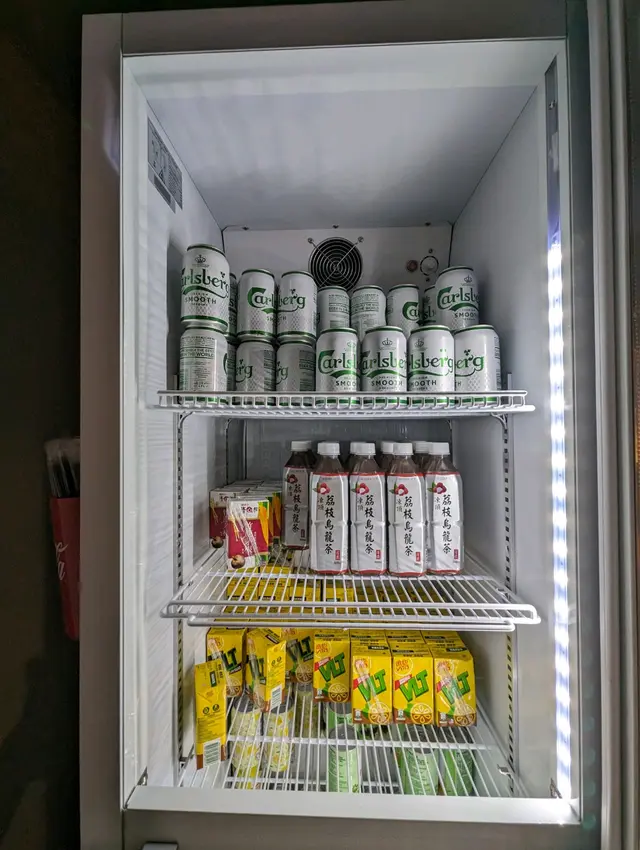 飲品嘅選擇多,汽水、茶、涼茶、啤酒都係任飲。旁邊仲有茶包熱水、薯條涼拌青瓜等熟食。