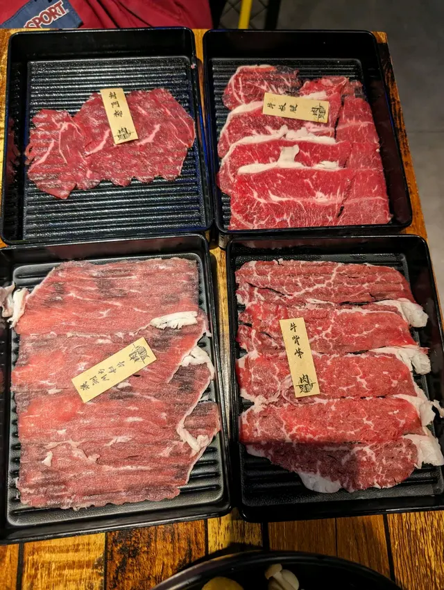 放題有三個set包唔同部位牛肉,我地揀左中間價位嘅Set B($298一位),肉類主要包左任食五個部位嘅牛肉、雞腿肉、豬五花、蝦等,用QR code落單,其餘配料及飲品就係自己出去拎。