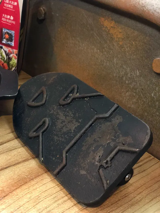 ironman樣既鐵板,店員話係用黎壓住舊豬肉燒,好似係受熱會平均啲,咁就唔會燒到其中一邊燶晒但另一邊都仲未熟