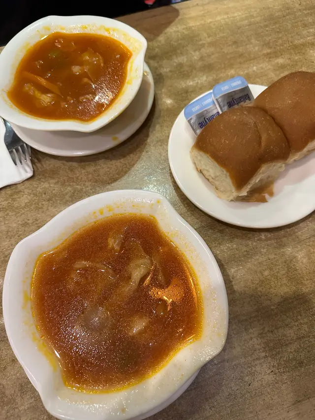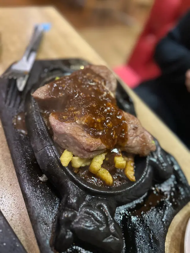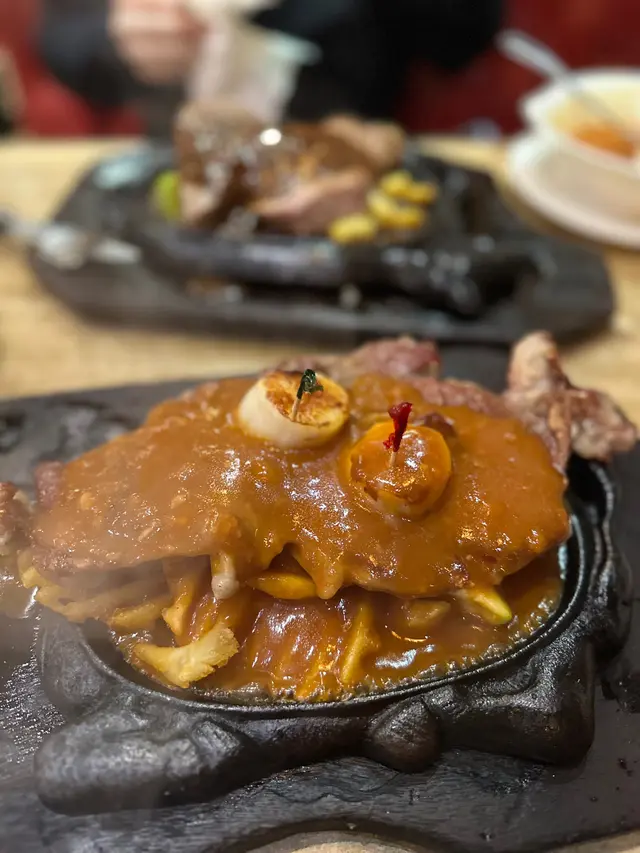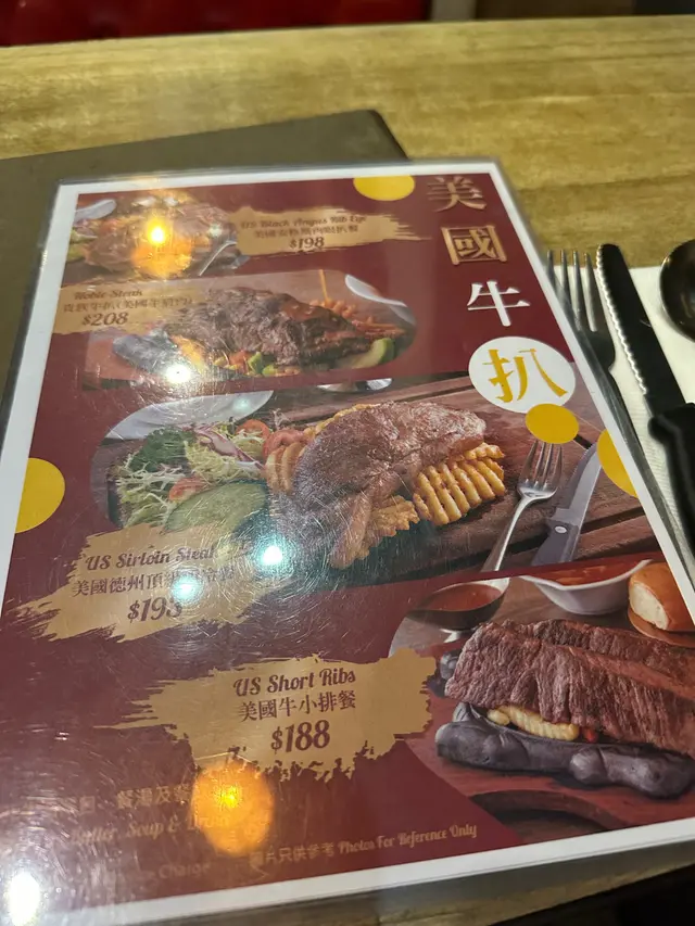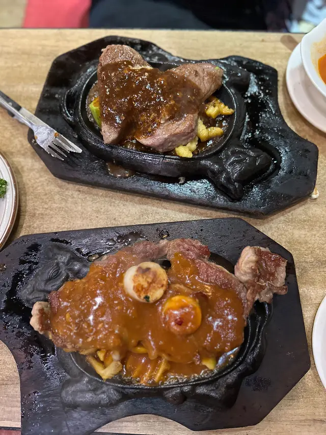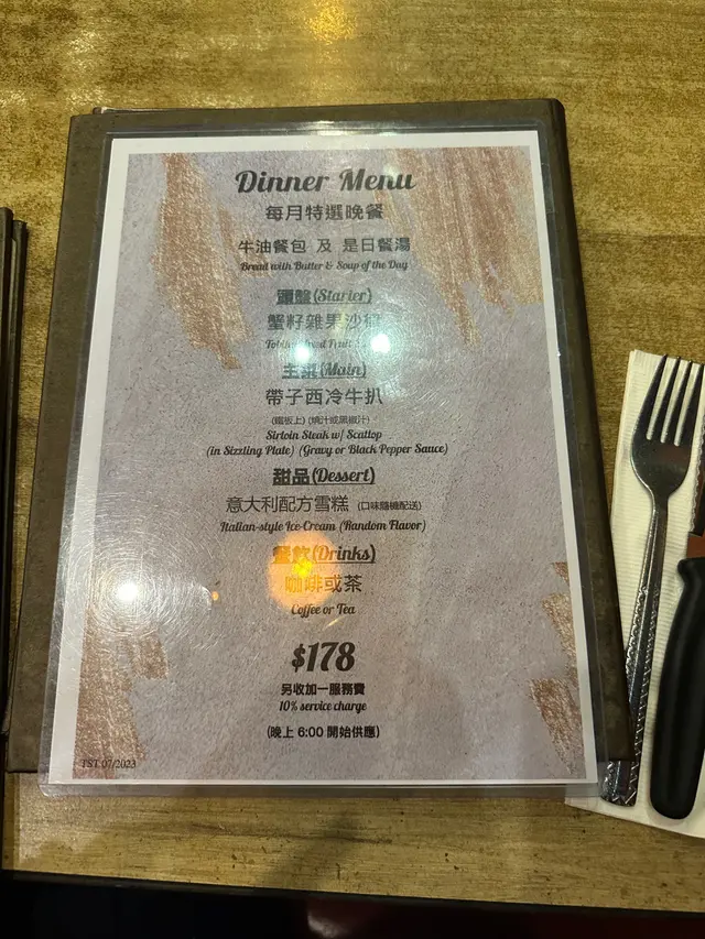 我地一人叫左一個餐,我叫左每月特選套餐帶子西冷牛扒7成熟配蒜蓉汁,套餐除左有牛油餐包、餐湯之外,仲有雜果沙律、甜品同一杯野飲,都只係$178。份量同以往一樣咁大份,最開心就係聽到d汁淋落鐵板上面既聲,非常療癒。