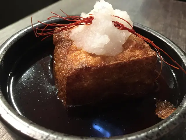 豆腐唐揚浸住係淡甜醬油汁內炸得金黃既豆腐外脆內軟.
