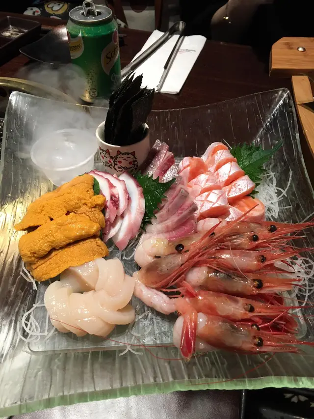 一坐低都未寫紙仔, 店員已經擺低一盤海鮮同刺身, 刺身都係大路野, 不過就有海膽試(encore海膽要加錢)