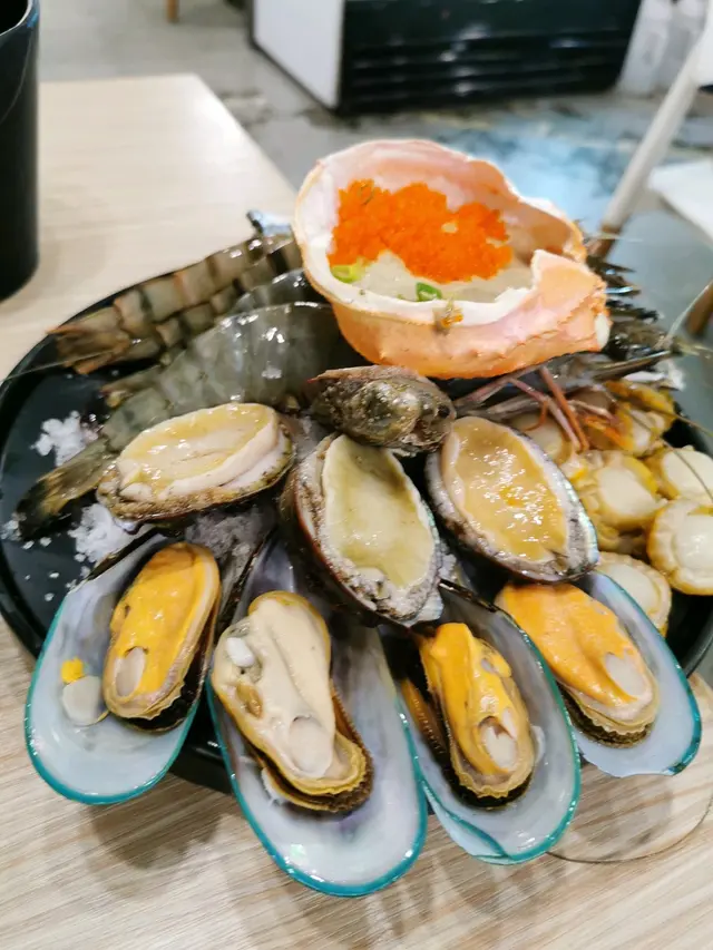 ,先嚟一個海鮮拼盤,包括有大大隻海蝦,鮑魚,蠔同扇貝,