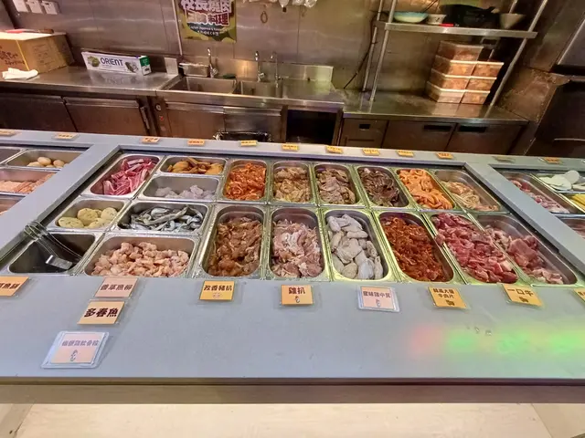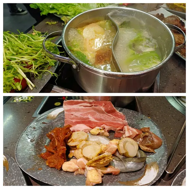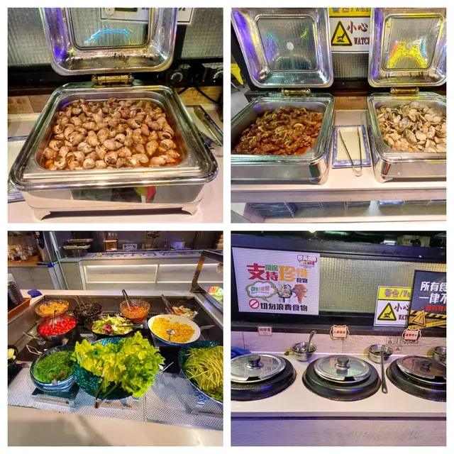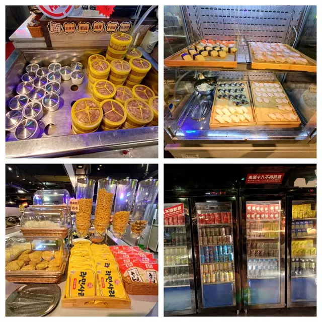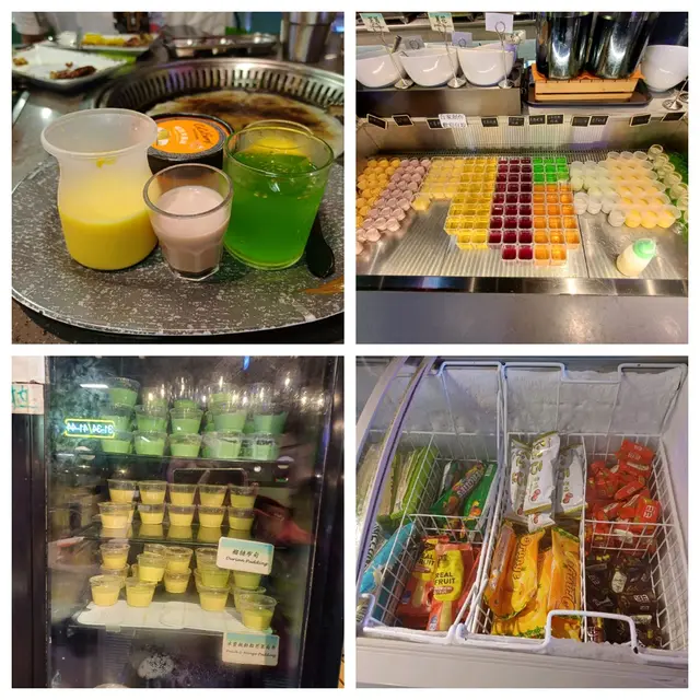 餐廳全數是自助,有熟食、燒烤及火鍋肉類等配料,有湯、甜品及飲品、沙律……等。