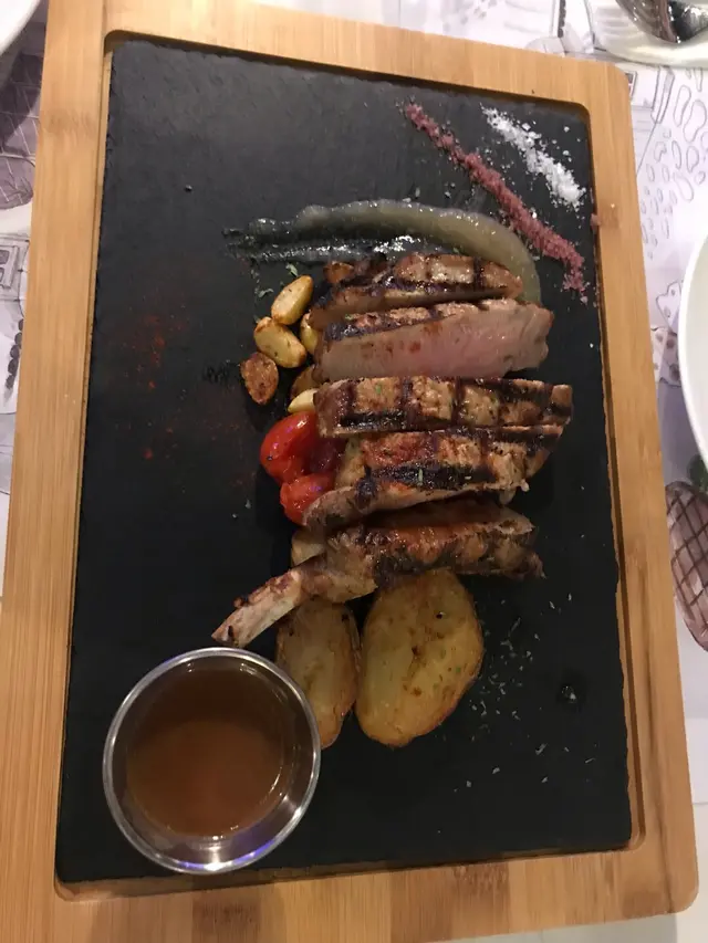 要左一客 燒西班牙黑毛豬架(8oz) 配青蘋果蓉,上枱時已經聞到陣陣肉香,再看一下肉的顏色,這是我想要的肉質,外面燒得香 把肉汁封住,內裏中心部位還是有少少粉紅,這是最佳吃黑毛豬的熟度,肉本身已經灑上少少鹽份,這能帶出黑毛豬的味道,肉質還是嫩嫩的帶嚼口,很不錯,加上酸酸少甜的青蘋果蓉,非常合拍非常好味。