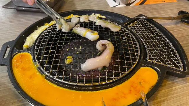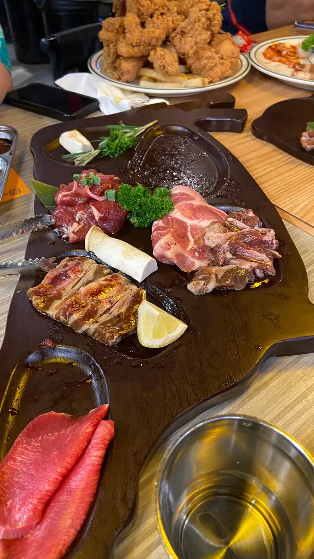 自助落單,前菜有醃蘿蔔,芽菜,薯仔絲,泡菜雞蛋,芝士任食,order咗1牛1豬2個set,另加一份芝士帶子八爪魚,4柸fruit soda,再加一份全隻原味有骨炸雞,上菜速度快,以為好少嘢,點知食唔晒,好飽!