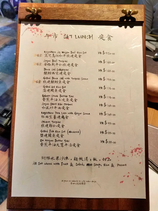 佢地 set lunch都幾多選擇,我地揀左個 安格斯牛扒照燒定食 同埋 銀鱈魚西京燒定食。跟餐有面豉湯、沙律、甜品等,好似都幾抵。