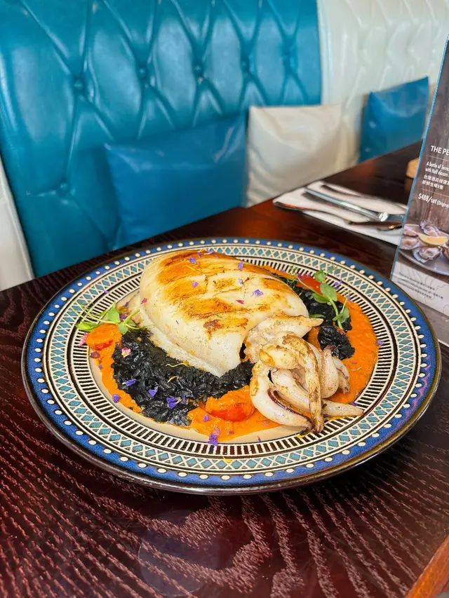 主菜方面,我哋試咗【原隻墨魚配墨魚汁意大利飯🦑。隻墨魚烤得幾香口,肉質算係彈牙,唔韌。個墨魚汁飯煮得幾creamy,飯粒有咬口,墨汁味都夠。旁邊嘅燴蕃茄帶啲酸甜,可以解吓膩。成個配搭都幾穩陣嘅。