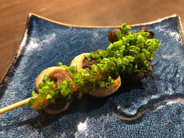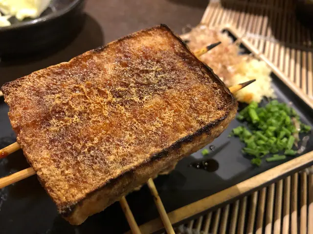 最後的燒豆腐($28/串)在烤豆腐旁伴有蔥花、薑蓉、木魚絲,加一點一起吃更具風味。