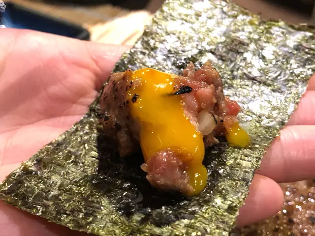 嗜牛的我平常屋裏不太煮牛,來到當然要點多一點牛串,但在廚師烤串之時,先來一個火炙韓式生牛肉($98)止止渴。這個生牛肉會先用火槍燒燒表面,又可以用紫菜或青瓜夾住同食,或是加點蛋汁,食法多變。