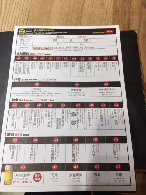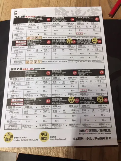 拉麵方面亦有兩種麵類選擇,有直麵或曲麵;硬度選擇分別為普通、硬和特硬。
