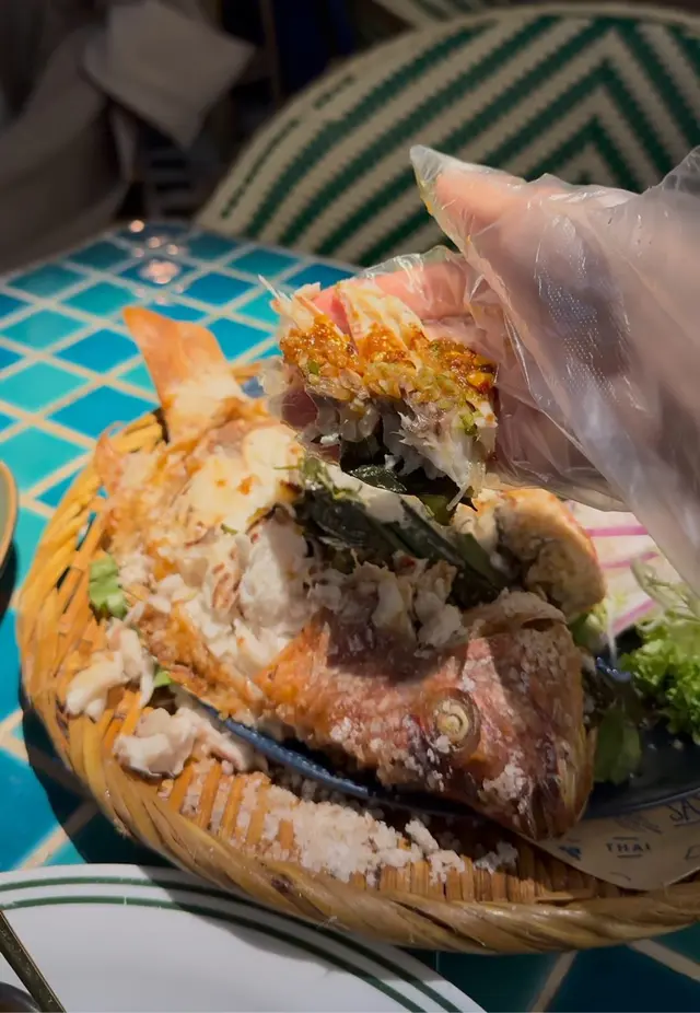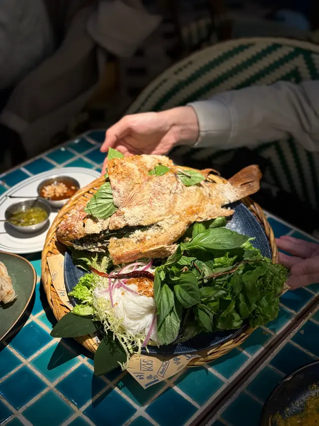 平時食開都係用火爐上嘅鱸魚,無諗過烤魚係咁大條🐟,成盤上連埋D菜同米粉勁澎湃!第一次用手挖魚肉,好raw呀🤌🏻~肉質超鮮嫩,本身鹽燒己經好惹味,仲可以加醬調味,當佢烤肉咁夾生菜食又得🥬,夾米粉又得,自製咖哩米粉都仲得~mix & match free style,點都好食❤️‍🔥!