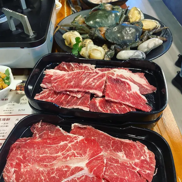 加湯就開始打邊爐,火鍋配料比較特別嘅有台灣腸同脆鯇,至於大蜆就小心有沙。至於特選海鮮有兩隻蟹、帶子同鮑魚,除咗出面嘅配料仲有得寫紙仔要各款新鮮肉類。推介牛肩胛、生蠔。
