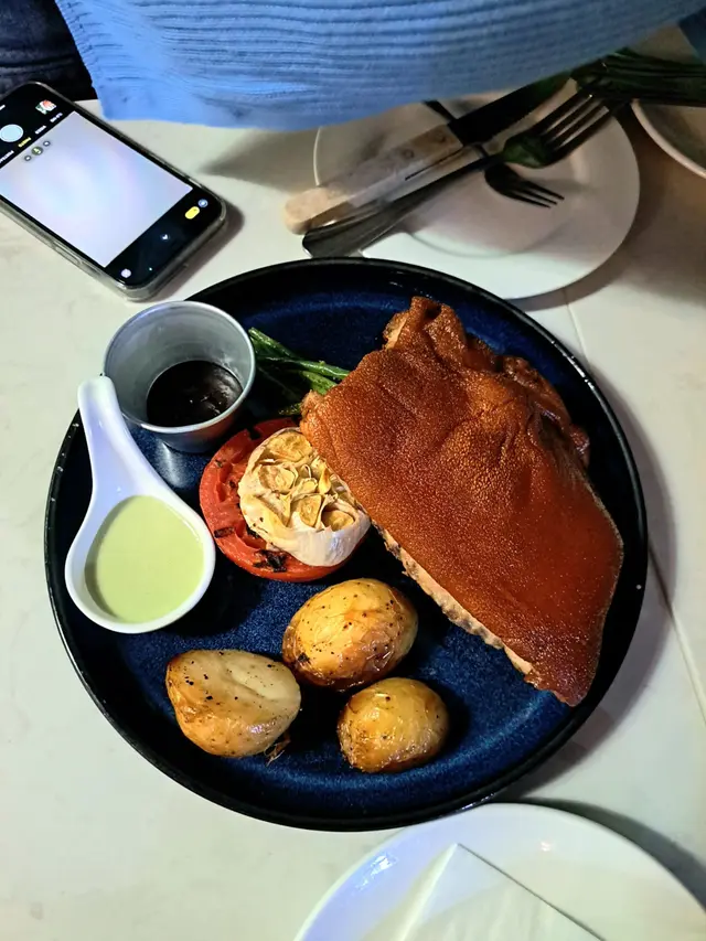 這個乳豬的豬皮特別香脆,肥瘦均稱,肉質軟林林的;再配薯仔、蒜头、豆和醬汁,令食慾大增。