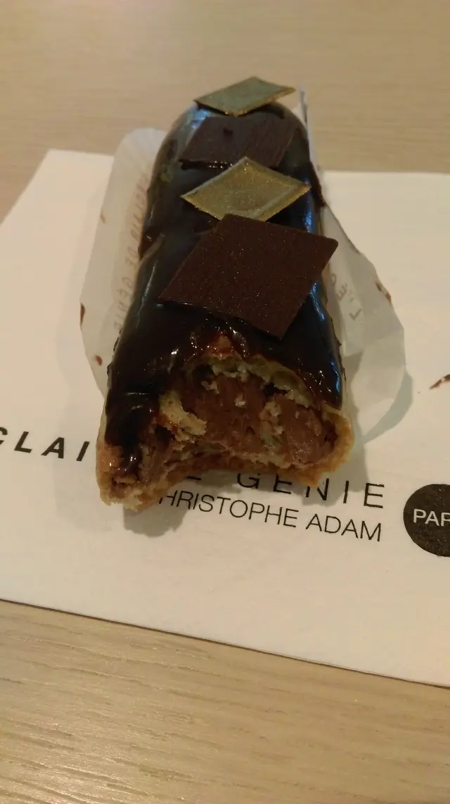 有閃電泡芙之稱是因為人們覺得太好食,吞進肚的速度簡直快如閃電!本抱著疑惑的心態去咬第一口,沒想到泡芙居然沒有一如法式甜品的甜,反而有著軟綿綿的入口溶化的感覺,外層那一抹的朱古力醬十分濃香,與朱古力片一起吃不會令人受不了。