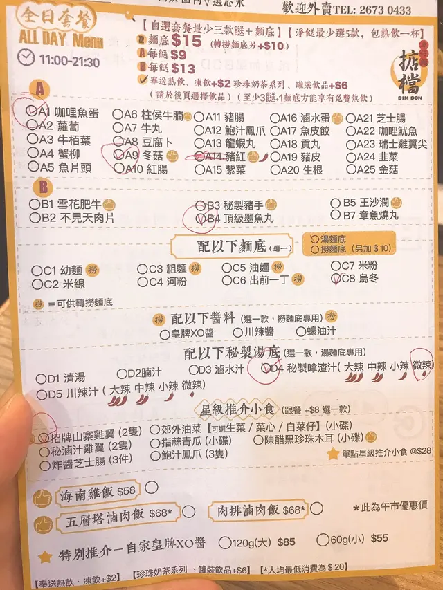 車仔麵先揀餸,然後麵底,再揀湯底(可選辣度),再追加小食