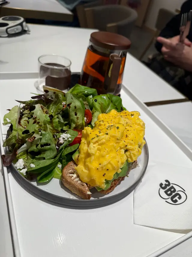 牛油果、蛋、芝士忌廉配酸種多士,顏色鮮艷動人,沙律菜、牛油果和炒蛋的份量十足,沙律菜和牛油果的綠與炒蛋的黃形成完美組合,搭配在酸種多士上,既健康又滿足的選擇。
