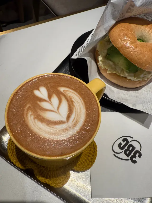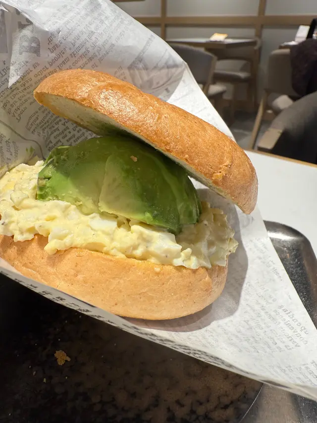 牛油果蛋Bagel賣相好吸引,Bagel好大個,中間佈滿新鮮的牛油果和蛋碎,呈現外脆內軟的口感,給朋友帶來滿足的樣子。