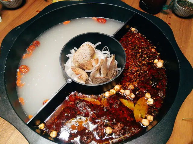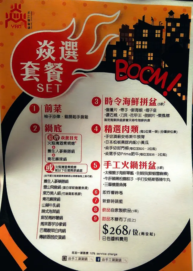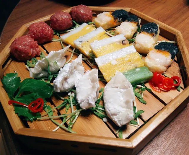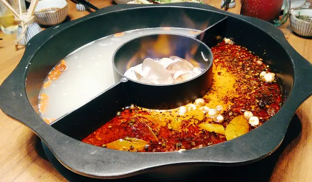 湯底一鍋有三格,可選三個不同味道,包括火焰清酒煮蜆螺、養生人蔘藥膳鍋及青花麻辣鍋。中間的火焰清酒煮蜆螺,侍應把鍋上枱後才逐隻放入。加入清酒後點火,熊熊烈火隨即燒起,大伙氣氛也高漲起來。眾人一邊聞著鍋中散發的陣陣清酒香,一邊期待著佳肴前來。