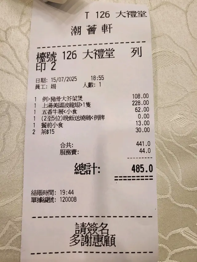 環境舒服🤩服務殷勤 南鯨Level 42025-07-17128 views Follow 「潮薈軒」酒樓位於觀塘市中心,店舖光猛整潔,大廳中間有部超大的電視,最欣賞是電視較了靜音,不會影響客人傾計。《送例牌燒鵝》晚飯時間送燒鵝,真是意外驚喜。例牌份量都很多。《上湯美國波士頓龍蝦伊麵》大大碟的龍蝦伊麵賣相吸引,龍蝦肉新鮮,伊麵軟硬適中,令人食指大動。《五香牛展》牛展薄切,令原本較韌的位置都變得軟腍,一口一塊,很滿足。《排骨大芥菜煲》超好飲的芥菜排骨湯,加入適量的胡椒,最適合夏天食。芥菜沒有苦澀味,爽口清甜。最後,服務員還送了綠豆沙和芝麻糊給我們,糖水甜度適中,完美。3The above review is the personal opinion of a user which does not represent OpenRice's point of view.LikeShare環境舒服🤩服務殷勤 潮薈軒 https://s.openrice.com/QrKT0rNrT00Report Post Ratings4Taste5Decor5Service5Hygiene4ValueDate of Visit2025-07-15Dining MethodDine InSpending Per Head$240 (Dinner)